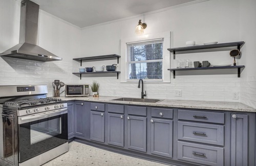 Now offering a washer and dryer! Located within walking distance to downtown Belton, less than a mile to the UMHB football stadium, 4 miles from the Expo Center, this vintage 1925 bungalow has been artfully restored. Enjoy our Art Deco touches and original flair like glass door knobs and refinished hardwood floors. The kitchen features a gas stove, stainless appliances, granite countertops, coffee bar, breakfast nook or game area. Please come sit on our front porch, listen to the church bells, and relax!
