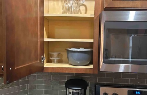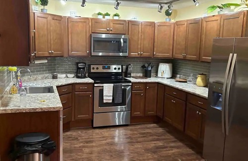 and picnic tables for relaxing. Living Room has 75' Tv- both bedrooms have 55' tv's. Large Sectional in Living room and large dining table in kitchen. Coffee bar- Washer & Dryer-Front Porch- Fenced in back yard.
