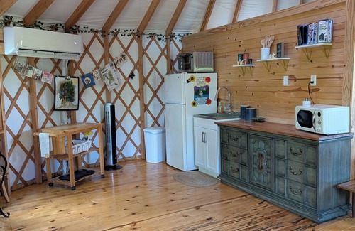 *The yurt is entirely yours to enjoy. Equipped with a queen size bed as well as a queen size futon you'll have plenty of sleeping room to sprawl out or snuggle up. If extra space is needed we can provide a queen size air mattress as well. The rainfall shower with on demand hot water along with natural lighting feel incredibly luxurious! Sit on the deck and take it the surroundings possibly catching a glimpse of the deer residents or dozens of wild turkeys. Go out and explore on a sunny day or cozy up with a good book on a rainy afternoon. Ductless mini split heating/cooling system will keep you comfortable year round.