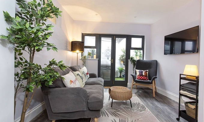 This stunning property offers 2 bedrooms one king size and one a small double. Kitchen with dining area and a cozy living room leading onto a outside area with a hot tub .