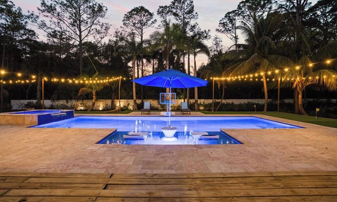 Best-rates for the Jupiter Farms house starts from $573 per night with includes Internet, Parking, Pool, Private Pool, Sports/Activities, Fireplace/Heating, Barbecue/Outdoor Cooking, Bedding/Linens, Wellness Facilities, Guest Services, Entertainment, TV, Balcony/Terrace, Security/Safety, Hot Tub, Kitchen, Laundry, Air Conditioner, Child Friendly with all other amenities. Perfect for Weddings is committed to ensuring every guest experiences a comfortable and extraordinary stay, whether planning a romantic getaway, a honeymoon, a pet-friendly stay, or celebrating with the entire wedding party.