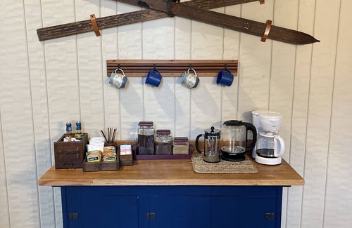 Grab a cuppa from our little café You’ll find a drip coffee maker, French press and electric tea kettle. Stocked with some coffee, tea, and hot chocolate as well creamers and sweeteners it’s a perfect place to jump start your day or wind down after a long adventure outside.