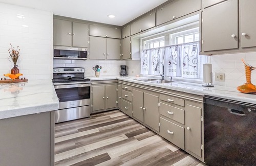 ~ Kitchen has full-size appliances including; electric range, fridge, dishwasher, and countertop ice maker. Most common cooking, baking, and servingutensils are provided.