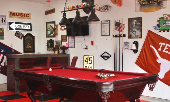 GAME ROOM: Full size garage with AC and fans, pool table, corn hole boards, washer boards, darts, chess, the ring game, and arcade games with unlimited, free game play