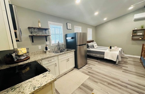 Relax with the whole family at our cozy barndominium studio in the Piney Woods of Kountze, TX—50 yards from the main house. Relax while sitting on the spacious porch drinking your favorite beverage—or unwind in the hot-tub made for two. You can also enjoy sitting on the deck overlooking the pond. Other area activities include trail hikes in the nearby Big Thicket National Preserve & canoe and kayaking down the Village Creek. This cozy retreat offers an open floor plan with 1 queen bed, a living room with 2 twin beds or can convert to 1 king bed, perfect for a small group of guests or a romantic getaway. The bathroom is equipped with a shower and a hairdryer for your convenience. Enjoy amenities like WiFi, heating, AC, a washing/dryer combo machine, and an iron during your stay. Kitchen has full size stove, microwave, refrigerator and coffee maker. We're happy to assist with any questions while you stay at our cabin.