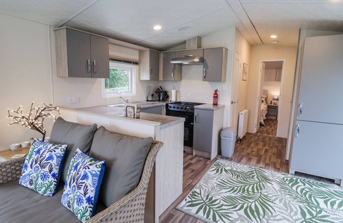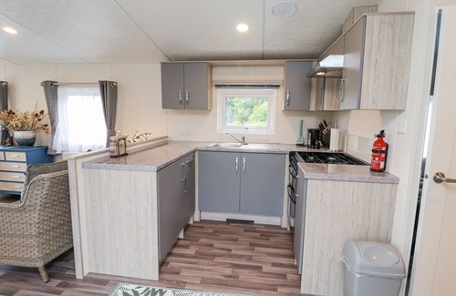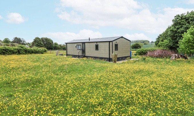 The Hoot, a single-storey caravan, consists of an open-plan living space including a kitchen with gas oven and hob, microwave, fridge/freezer, and washing machine, a dining area, and a sitting area with Smart TV and electric fire. The bedroom is a double with en-suite basin and WC. There is a shower room with walk-in shower, basin, and WC. Outside, there is an enclosed wraparound garden with lawn, patio, furniture, fire pit, and off-road parking for two cars. Two well-behaved pets welcome. Sorry, no smoking. Shop 2.8 miles, pub 1.3 miles. WiFi, fuel, power, bed linen and towels are all included in the price. Bring your special someone to The Hoot for a private retreat. Note: Check-in from 4 pm, check-out by 10 am. Note: This property has a Good Housekeeping Bond of 150 GBP. Note: Steps up to the property, please take care.