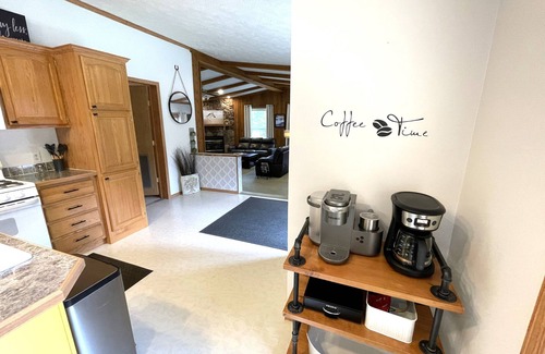 The Horse Inn a Round offers a large open floor plan to enjoy meals and playtime together. The living room, kitchen and dining area are spacious and flow easily into each other making this a great gathering space for family and friends. Enjoy hanging out in the living/game room – complete with a full-size air hockey & checker table, couches and numerous comfortable recliners and chairs. Relax in front of the cozy fireplace or enjoy a movie or game on the 75” TV. The kitchen and dining area are comfortable spaces perfect to prepare a meal and socialize. The kitchen is fully equipped and has all full-size appliances and plenty of cookware.