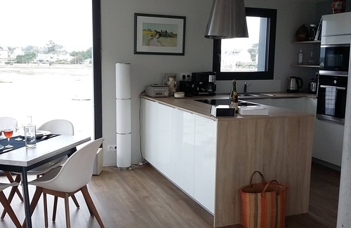 This architect house is located at the bottom of the port of Argenton Landunvez she overlooks. It benefits, by its large picture windows, of an exceptional view on the port and the movements of the tide. The beaches are nearby, the Rochard beach is 100 meters walk, a safe path for children. Other white sand beaches are easily accessible and to choose according to the orientation of the wind. The beach of Penfoul (famous surf spot) is 1500 m.