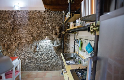 The characteristic Casa dei Ciottoli, entirely covered with small stones of sea and river, is located in the center of Castelnuovo Cilento, a medieval village in the heart of the Cilento National Park at 280 meters above sea level. The village enjoys a dominant position and a fantastic view of the Alento Valley and the Cilento coast. The house is the work of the peasant architect Guerino Galzerano who in the same village has realized with the same technique three other sites: the garden under the Tower, Santa Caterina and his tomb.
