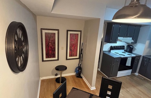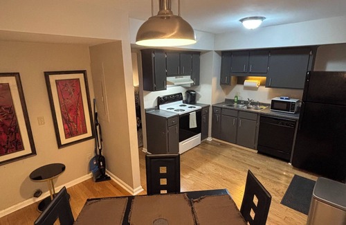 The townhome is well furnished with a nice sturdy couch where you can kick your feet up, relax and read or watch your favorite shows. Beautiful kitchen equipped with basic kitchen essentials. A dining table that seats 4.
