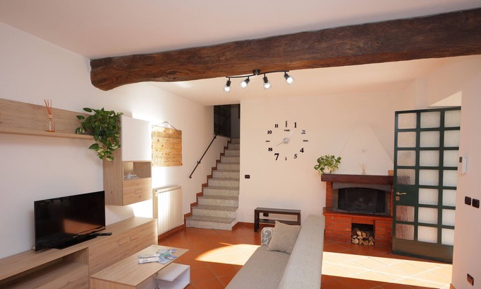 L'appartamento, di 80 m2 è suddiviso su due livelli. Al piano terra si trova un ampio salone con camino, divano e Tv HD.