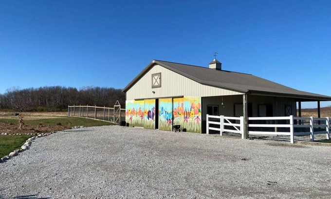 Latitude change at the secluded rustic Hruby Ranch where 50 acres of private land await you. Experience the freedom of Ranch life in our spacious with soaring ceilings fully equipped unit. Explore miles of trails. Visit Alpacas, goats, a peahen, ducks, chickens, deer, wild birds and much more. Complete the day under the large pavilion at the fire pit. Located 12 minutes from I 65 and 15 minutes from downtown Crown Point and 20 from Valparaiso. 25 minutes from the Indiana dunes and Lake Michigan!