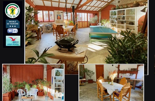 Communicating with the living room, an old workshop has been transformed into a living room or winter garden depending on the season, it is equipped with a garden furniture with a heated parasol, an electric barbecue and a ping-pong table. -pong.