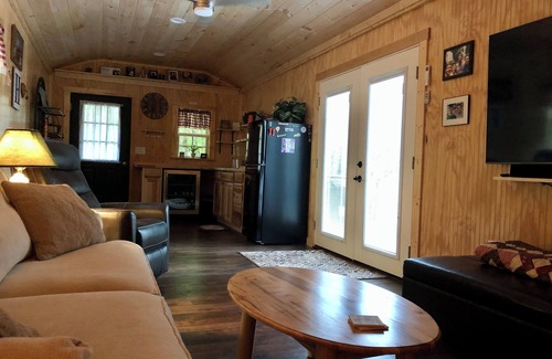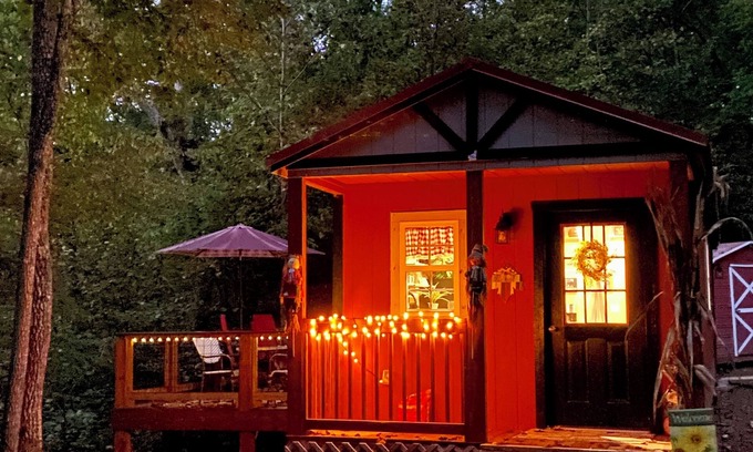 This charming cottage is situated amidst the serene woods, away from the hustle and bustle of tourist areas. The tiny home boasts a fully equipped kitchenette with a refrigerator , microwave, and coffee maker. Prepare simple meals while enjoying the natural surroundings. It offers tranquility while still being conveniently close to nature and nearby attractions. Within the home you'll find a fully equipped bathroom with modern amenities, featuring an eco-friendly incinerating toilet and washer & dryer. Embrace outdoor living with a propane grill, perfect for cooking up delicious meals under the starlit sky. Relax on the patio, or gather around the firepit. This cottage offers a touch of luxury-think A/C, heating, high-speed internet, smart tv, and beautiful wood finishes. Glamping at its finest!