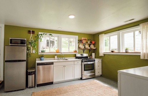 The apartment is fully equipped with everything you need for a comfortable stay. The king size bed has an organic Avocado mattress to give you a restful night sleep. There are also two twin fold out beds that are available, and reported to be quite comfortable. These can be combined for a king size bed, or used separately as twin beds. The kitchen is fully stocked with dishes, baking supplies, coffee, and even a popcorn popper. The furniture and decor throughout the space holds a retro vibe that makes the apartment unique and comfortable. The living room has a 52" smart television that is ready for your viewing pleasure. There is even a fire pit in the back yard ready for your evening enjoyment.