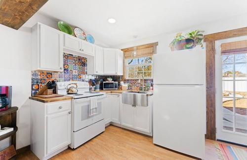 The kitchen features Talavera tile and butcher-block countertops, as well as brand new appliances. You will also find all the cooking utensils, pots, pans, blender, mixer, crockpot, cookie sheets, plates, bowls, cups, and flatware you need to cook a full meal. Plus, a coffee bar setup!