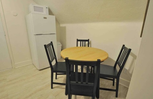 Up on the 3rd floor, the Hide Park Hideaway is awaiting your visit. Our apartment has just been renovated, with a fresh modern design. It has 2 queen beds, and a seating area with futon, and mounted TV. We also have a small kitchen, and full bathroom with walk-in shower. Our kitchen has all needed items to prepare a small meal, and there is a dinning table for up to 4 in the eating area. You must climb 2 flights of narrow stairs to get there, but it is so worth the effort!