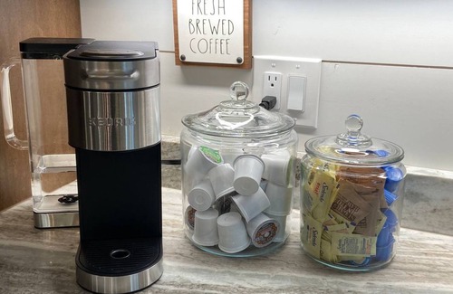 Our open kitchen, with stainless steel appliances, has everything you will need. Whether you want a pizza pan or an electric griddle we have you covered. If you want to stay in and bake cookies, make a smoothie and pancakes for breakfast in bed, or whip up a martini you will have all the tools at your disposal. We also have both an icemaker and coffee bar for your enjoyment. Indulge in an assortment of Keurig pods, sweeteners and creamer because any good day should start with a hot cup of coffee.