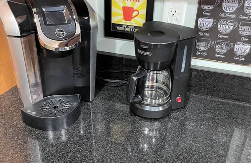 The kitchen features microwave, disposal, pull-down sprayer faucet, gas stove, full size refrigerator, ample cabinet space and granite countertops. There’s a keurig and a drip coffee maker.