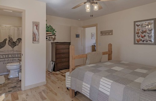 'The Coop' is our downstairs room, which is easily accessed without any stairs. It has a queen bed with a comfortable organic cotton mattress, along with premium organic cotton sheets, your choice of high quality memory foam or goose feather pillows, and a cotton quilt. The breathable natural materials ensure a comfortable nights sleep. The room has a fully stocked kitchenette with a mini fridge, microwave, and coffee maker, along with freshly ground coffee, cream, and sugar. This room also has a view overlooking the beautiful open pasture from the private deck.
