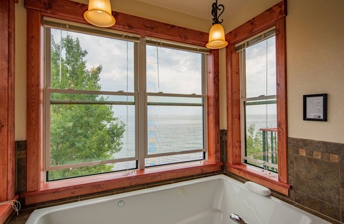 Located only 40 feet from Lake Superior s beach is the Inn at Croftville Road Cottages. This unique and newly crafted building with tall multiple gabled peaks houses 5 vacation suites all with private exterior entrances. The Inn at Croftville Road Cottages #5 provides the gentle sound of breaking waves hitting the shore and spectacular views of Superior. It is designed with romance in mind. This 2-story, 1-bedroom vacation suite has a main level living room and well-equipped full-size kitchen and an upstairs bedroom and bathroom. One enters this suite from a covered porch on the Grand Portage side of the inn. The living room features a romantic wood fireplace with a large raised hearth and firewood, a smart TV and DVD player mounted above the mantle, a dinette set in a bay window looking out to Superior, a radio/CD player, and a futon. The upstairs bedroom has a plush queen bed, a decorative gas stove, and a spa tub for 2 in the bay window looking out to Superior. The luxurious bathroom has access from the stairs landing without entering the bedroom. This four-season inn suite is open all year and has wireless internet access. An artesian well provides excellent water for drinking. The Inn at Croftville Road Cottages #5 sleeps up to 4 people (2 on the futon) with all linens provided.