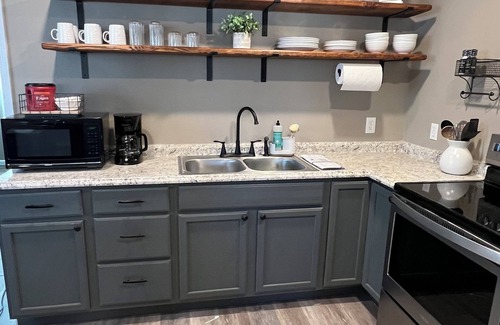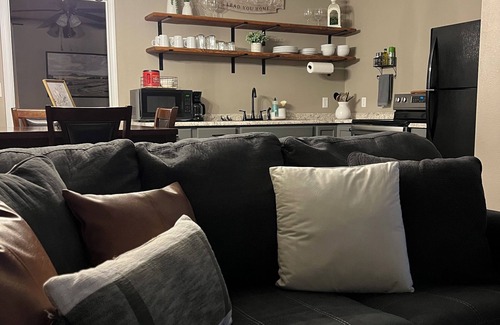 You enter The James Stay directly off of Old Route 66. The driveway is long enough for two cars, a third could park in-front of the deck if needed. You’ll enter the house with the provided door code. You enter into the living room, there is a coat rack behind the door to hang your jacket on, kick your shoes off there if you’d like. To the left is an oversized comfy sectional and to the right is the 65 inch smart TV. The living room flows into the fully equipped kitchen and the dining area. Off the dining area you’ll enter into bedroom number one, complete with a queen size bed and a small closet. There is an extra blanket and pillow in the closet. Walk back through the kitchen area to a small hallway. The bathroom with a full shower, double vanity, fully stocked with shampoo, conditioner, body wash, cotton rounds, Qtips, plenty of towels, hair drier, and 3 rolls of toilet paper is on the left. On the right is bedroom number two with a queen size bed, there are games in a basket up top of the closet along with an extra blanket and pillow. You continue down the hall through the laundry area with a washer, drier, and supplies for a few loads of laundry. Past that is bedroom number three, with a queen size bed and a large closet, with two extra blankets and pillow. There’s also a desk and chair where one can conveniently work from the house if needed. There is a door that exits from the bedroom to the fully fenced in back yard, you may also enter the back yard from the gate by the driveway. In the back yard you’ll find a little fire pit area where you can gather around with family, friends, and pets.