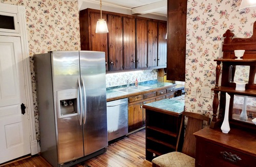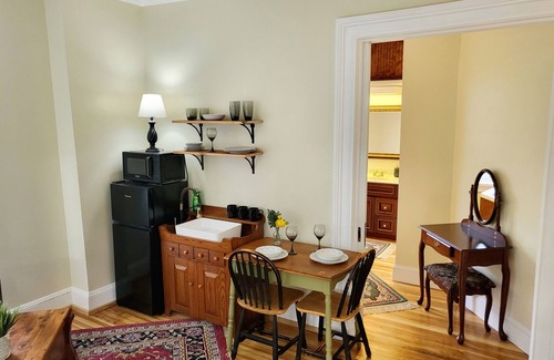 This unique place has a style all its own! The Jarboe Suite takes its name from the Jarboe family, the original 1948 builders of Manor House at Gayfield. The bedroom boasts an antique canopy bed, wonderful marble topped dresser and washstand, new mini-split HVAC, and the the large bathroom includes a large corner spa tub. The Jarboe Suite is situated nicely with a small kitchenette that includes a dry-sink conversion, countertop cooktop, microwave, basic pots and pans, and utensils.