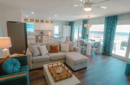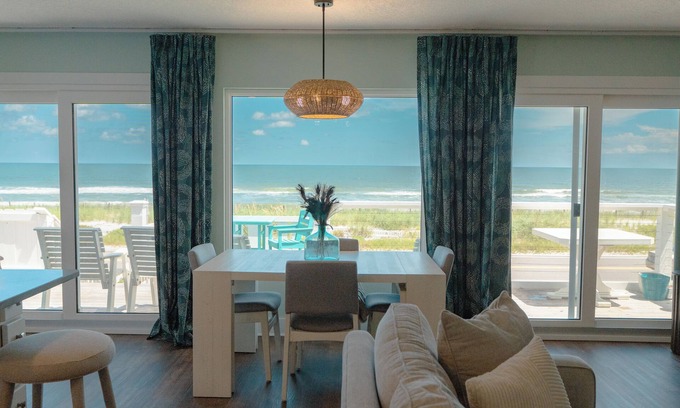 Quiet Flagler Beach home, newly remodeled, and nestled between Daytona Beach and St. Augustine. Bright 2-BR oceanfront home with cable TV, internet, plank flooring throughout. Fully furnished, full kitchen, 2 porches, laundry, outdoor shower. Complete with stocked kitchen, linens. We are a short walk to the closest beach walkover.