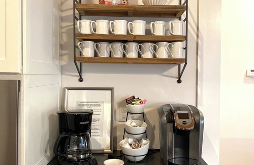 The open concept living area of the John-Marie House features comfy seating, a 50 inch smart TV, original art, quartz counters, stainless appliances. The kitchen is equipped with full size stainless appliances, microwave, toaster, Keurig coffee maker, standard coffee maker, (complementary coffee provided) nice selection of pots and pans, drink ware, dinnerware and eating utensils.