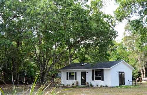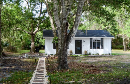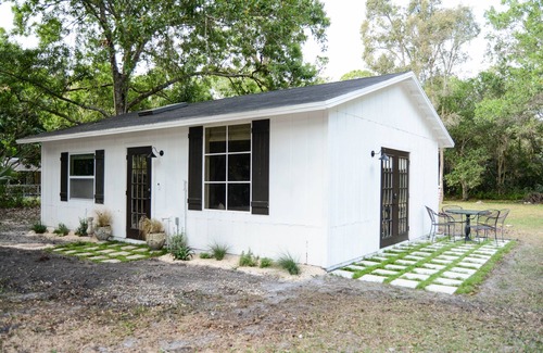 A quaint guest house nestled on an acre property, with modern amenities and a relaxed inspired design. This private 600 sqft cottage has an airy open floor plan which includes a kitchenette, full bathroom, king sized canopy bed, and living room with sofa bed. The double french doors lead to outdoor seating under mature oaks and tropical vines. Located walking distance from downtown shops, parks, and minutes from local beaches.