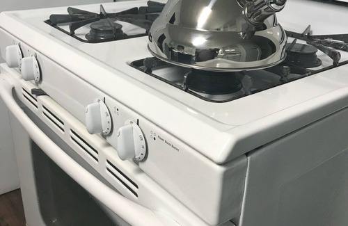 Large country kitchen with dishwasher, fridge, gas range, cooking/eating housewares