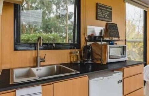 After a day of exploring, come home to a cozy 139-square-foot tiny house designed for comfort and simplicity. It features a queen-sized bed, ideal for two adults, along with easy access to water, split-system air conditioning, a kitchenette with cooking equipment, and well-appointed bathroom facilities.