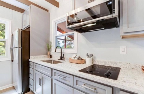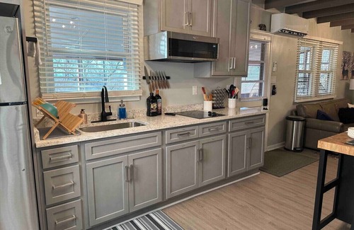 The adjoining kitchen and dining area are designed for connection, featuring stainless steel appliances and a suite of high-quality small appliances, including a Vitamix blender, KitchenAid mixer, Instant Pot, toaster, and air fryer/convection oven (note: a traditional full-size oven is not present). Though compact, the kitchen is beautifully equipped for home-cooked meals or simple wine and charcuterie nights in.