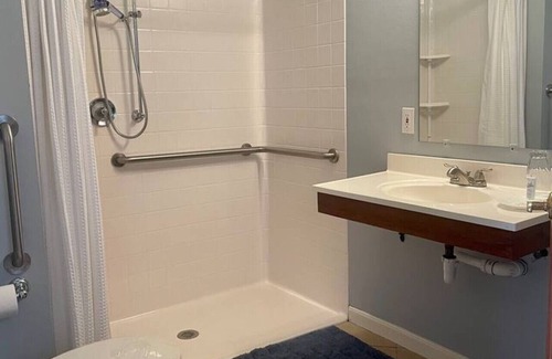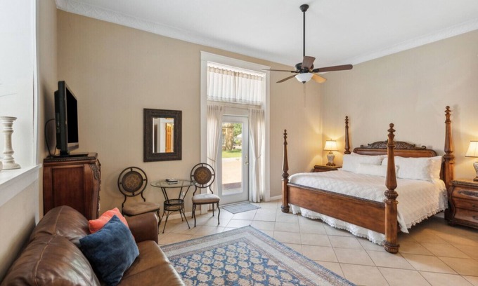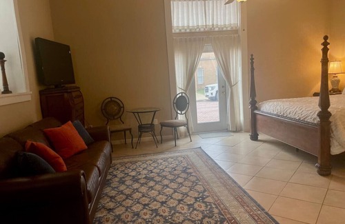 Stay in a luxurious large hotel room in downtown Eastland. The Justin Room is handicap accessible with a walk-in shower and includes a refrigerator, microwave, Keurig, and a large television with cable. It features a king size bed and queen sofa sleeper, and has its own exterior access with parking just outside for convenience. Breakfast, snacks, juice, and coffee available 24/7. Come enjoy the charm and elegance of The Eastland Historic Hotel!