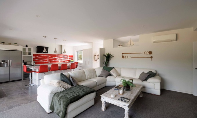 You'll be greeted by a large parking area, perfect for those with a boat or a couple of cars. Through the front door you will find the a modern kitchen and living area with all you'll need, including a Nespresso pod machine for that morning coffee fix (please note the coffee machine takes the large Vertuo disk pods, so please bring your own as they aren't available in Motueka). Grab the weeks groceries before you arrive as the house has a large double door fridge and a separate drinks fridge. Also included is a dishdraw dishwasher. The large breakfast bar seats six while the large leather lounge suite will also accommodate your group. Chill out with a book or watch Netflix (use your own login). Please note we don't have terrestrial TV however casting/mirroring off your mobile device works fine. The living area includes aircon for those hot nights.
