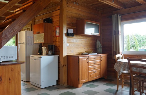 Chalet larch, with covered terrace and balcony upstairs. 64 m2, very warm, heated by reversible air conditioning, kitchen equipped with a fridge-freezer, cooker, hood, microwave, food processor, coffee maker, kettle, toaster, blender, pressure cooker, dishwasher, utensils and dishes in good condition and in sufficient quantity; Dining Area.