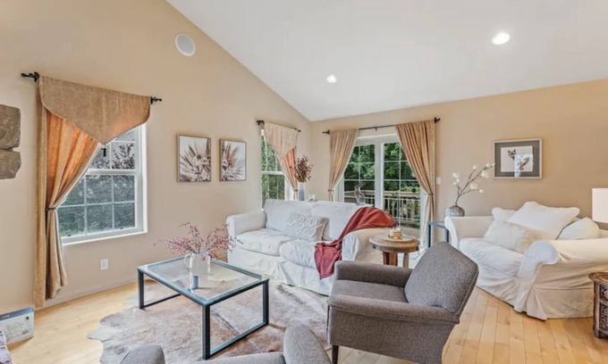 Our Cozy house has 2 large living rooms and a dining room, a movie theatre, fully-equipped chef's kitchen, inside laundry room, 2 fireplaces and an outside deck with beautiful views of the hillside. There is a driveway and attached garage for parking.