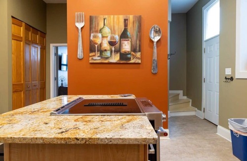 On the main floor, relax and watch a movie in the tastefully appointed living room, prepare your favorite culinary creations in the open kitchen, or even do some work if you are traveling on business in the Den. On the second story, you'll find three comfort-forward, calming bedrooms. Finally, a wow-worthy, decked-out entertainment center awaits you on the third floor.