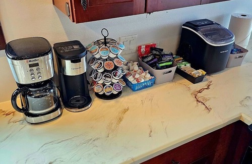 Kitchen: Has fridge with ice maker/filtered water, electric stove/oven, microwave, dishwasher, full set of dishes including kid friendly/plastic options, pots and pans for cooking, tupperware storage containers, toaster, basic cooking spices, cooking spray, regular coffee pot (12 cup) with individual ground coffee packets, a single serve K-cup coffee maker with a variety of K-cups to choose from, single liquid coffee creamers (non dairy), Splenda packets, and The Raw Organic white sugar packets. There is also a large cabinet with other basics such as a first aid kit, mosquito spray, sunscreen, additional dog supplies, and a variety of board games and puzzles.