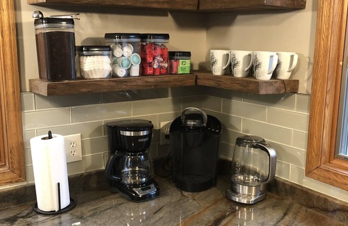 The kitchen is fully equipped with range, microwave, dishwasher, coffee maker (traditional and Keurig), refrigerator, toaster, blender and all cooking utensils. For outdoor cooking, you'll find a gas grill, charcoal grill and dining table.