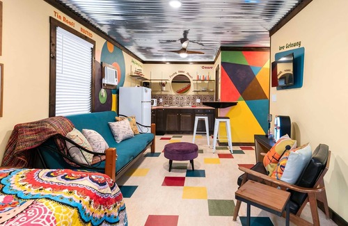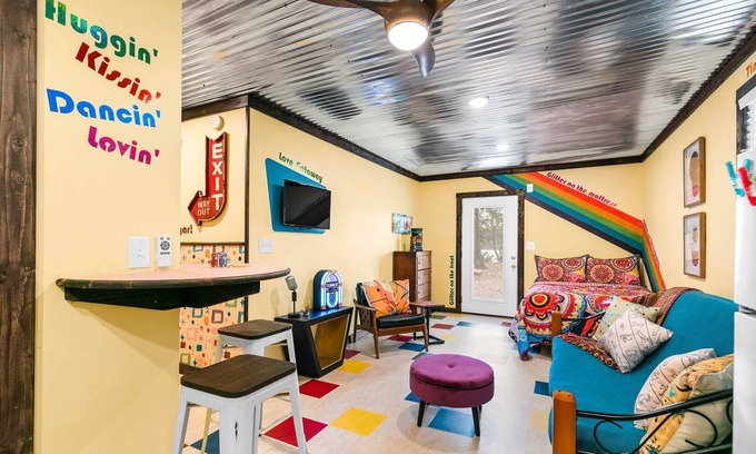 Upon arriving at Hideaway Resort, you will instantly fall in love with the peaceful and tranquil setting. The cabin is standalone and away from most cabins on the property. "Bang, bang, bang, on the door baby!" From the outside you would never know there is a fully themed cabin on the inside! "Knock a little louder baby!" In the entry you will find a spacious area for coats and suitcases. Round the corner to find "glitter on the hallway" just as the song describes. With unique wallpaper and custom designed floor - you will truly feel like you are with the B-52's! The hallway walls are covered with B-52 memorabilia as well custom-made items to match the theme. Don't forget to look up! "Tin Roof!" You know we had to do it.
