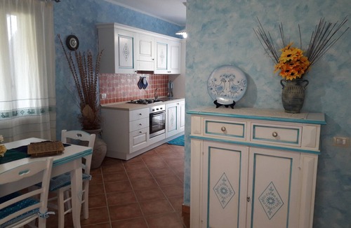 Apartment with garden on the ground floor. Composed of living area where there are kitchenette, equipped with refrigerator, oven, stove and sink and dining room with table, chairs, television, mobile sideboard, a double sofa bed. The living area and the master bedroom are CLIMATE. Two bedrooms, one double and one bedroom equipped with three beds. Bathroom with sanitary, shower and washing machine. Arrangement of ironing board and iron and hairdryer. Outdoor barbecue and shared swings. Independent outdoor shower for each apartment. Veranda with sitting area, table and chairs for outdoor dining. The apartment is furnished with Sardinian style furniture, well lit and very welcoming. IUN: P5076