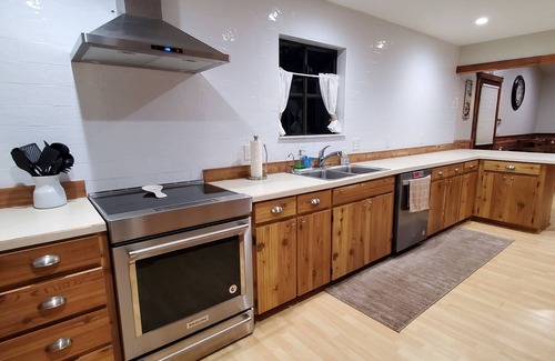 • Kitchen equipped with a convection oven with induction cooktop , dishwasher, garbage disposal, microwave, air fryer, instant pot, crock pot, toaster oven, toaster, coffee maker, tea kettle, blender, and a refrigerator/freezer with ice maker plus drinkware, barware, cookware, dishes, utensils, and flatware