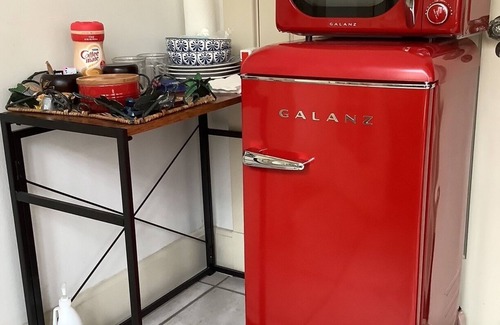 The private guest area sunroom has a mini refrigerator with ice trays/freezer, dishes, utensils, coffee maker & cups. A microwave oven is also in the guest area. Ground coffee and condiments are provided.