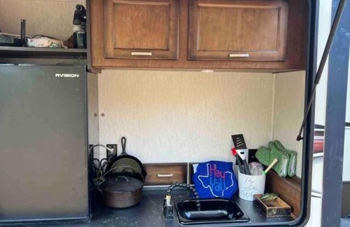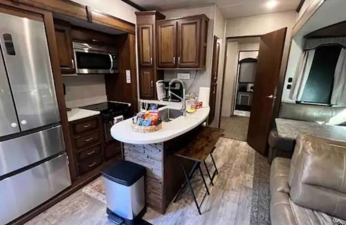 *38 ft 2 bedroom/2 bath RV w a kitchen stocked w spices, coffee pot, coffee, creamer, dishes, pots, pans, Ninja blender, toaster, sheets, towels, pillows, blankets, etc. The living room has a 48” TV w Roku control, dining table & couch. Main bedroom has TV w Roku control, Tempur-Pedic mattress, closet, hangers, dresser, Iron & 2 luggage racks.