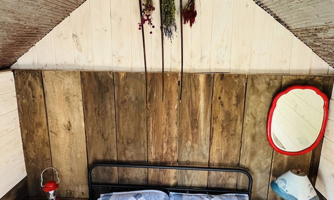 Experience the farm on a whole new level. We bring luxury to camping all while enjoying the comforts of home. Lea is a noun meaning 1. GRASSLAND, PASTURE 2. usually ley : arable land used temporarily for hay or grazing 3. There is nothing that she enjoys more than to see Guernsey cows grazing on pasture and we are excited to share this experience and our recreational tiny cabin with you. The Lea provides guests with a unique Farm-Stay experience. The cabin is located at the edge of one of our pasture fields and features quaint accomodations for up to 4. There is no electricity at this location or running water. The Lea is off-grid, but don't let that scare you. Take glamping (glamorous camping) to a whole new level in The Lea with a propane heater, a solar battery with limited power for charging your phone and lighting, potable water and a seperate compost toilet provided for your comfort. Wake up early to view nearby cows or horses grazing in the pastures, widllife (we often see deer, turkey, a variety of birds, and occassionally a bald egale or bear), or sleep in while enjoying soft linens on a comfortable queen sized bed. The Farmhouse queen bed features cozy quilts and flannel sheets when its cool outside. The loft provides additional space for up to 2 people (most suitable for children) and includes a queen mattress. Sip coffee on the porch or enjoy a bottle of wine while experiencing the outdoors in a new way. The interior of the cabin is uiniquely decorated with repurposed barn wood and tin from buildings on our farm. The red interior wall is recycled wood from a New Holland silage wagon. It includes custom end tables built from wooden feed pallets and is decorated with an antique loft hay fork and dried flowers. Guests have the opportunity to add breakfast to their overnight experience, or can cook their own meals on the open fire (firewood provided). We provide a cast iron skillet, hotdog sticks and mountain pie irons. An outdoor table provides space for outdoor dining. We apologize, but this cabin does not allow animals due to the location of the site in our field. Limited parking in the field is available and you must walk a short distance to the cabin. Bring your flashlight or use one of the ones that we have provided. The Lea is a perfect getaway where you can truly unplug and get back to nature. In the summer, viist our acres of sunflowers and wildflowers or book a farm tour with your hosts. We also process our own milk, cheeses and ice cream - all of which can be purchased at our own site self serve store, The Red Shed.