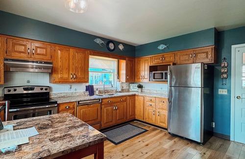 With a fresh nautical look, this home fits perfectly in the edge of the Mississippi River. A great place for larger groups with charm and character of 3 bedrooms and 2 baths decorated for the river! The primary bedroom, with a king bed, is on the main floor with an attached bath. The other two bedrooms are on the 2nd level. The first bedroom has a queen bed and a twin bed. The second bedroom, with river views, has 2 double beds.