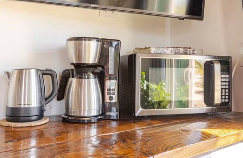The property is 5 acres, with unoccupied 5 acre parcels all around it. The cabin is fully fenced with a gate. The space is a studio: there is a living area with a large 4K smart TV, surprisingly solid WiFi that has worked great for everyone that has been working from home, full bathroom, a bedroom nook, and the kitchen has all you would need to cook (fridge, microwave, stovetop, dishwasher, toaster oven, pots, pans, cutlery, spices, olive oil, coffee, tea). The cabin has a mini split unit for both heating and cooling. There is a spectacular deck for sitting outside and taking in the glorious views. The cowboy tub is bathtub sized and ready to be filled with fresh groundwater temperature water in the summer. There is a small camping like grill. New outdoor bed for comfortably taking in all of the stars.