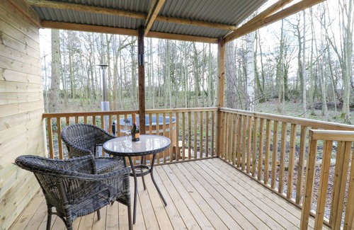 Amenities: Electric central heating. 2-ring gas hob, fridge, kettle. Fuel, power and starter pack for woodburning stove inc. in rent. Bed linen and towels inc. in rent. Off-road parking. Decking with furniture, hot tub and barbecue. No smoking. Shop 2.1 miles, pub 1.3 miles. Note: This property has no WiFi. Note: There are steps up to the property, please take care. Note: Adult only. Note: Additional logs will need to be purchased from the owner or locally. Note: Property is located in woodland area so may be dark, torch provided but please feel free to bring your own. 1 well behaved pet allowed.