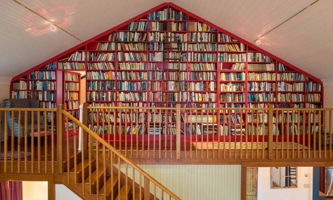 In the Blue House, a loft apartment above the detached garage provides a separate accommodation with a Queen bed, kitchenette, and office space and yet another wall of books! There is a window AC unit for this space.